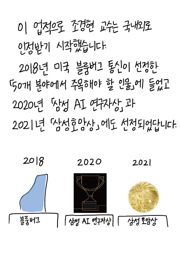 2018년 미국 블룸버그 통신이 선정한 「50개 분야에서 주목해야 할 인물」에 들었고 2020년 「삼성 AI 연구자상」과 2021년 「삼성호암상」에도 선정되었답니다.