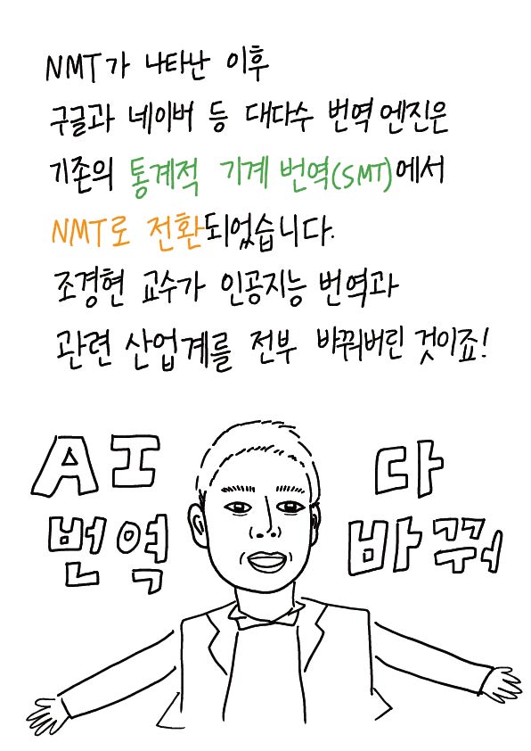 NMT가 나타난 이후 구글과 네이버 등 대단수 번역 엔진은 기존의 통계적 기계 반약(SMT)에서 NMT로 전화되었습니다. 조경현 교수가 인공지능 번역과 관련 산업계를 전부 바꿔버린 것이죠!