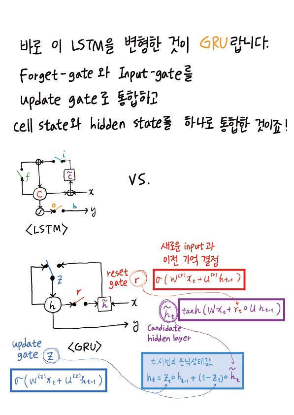 바로 이 LSTM을 변형한 것이 GRU랍니다.