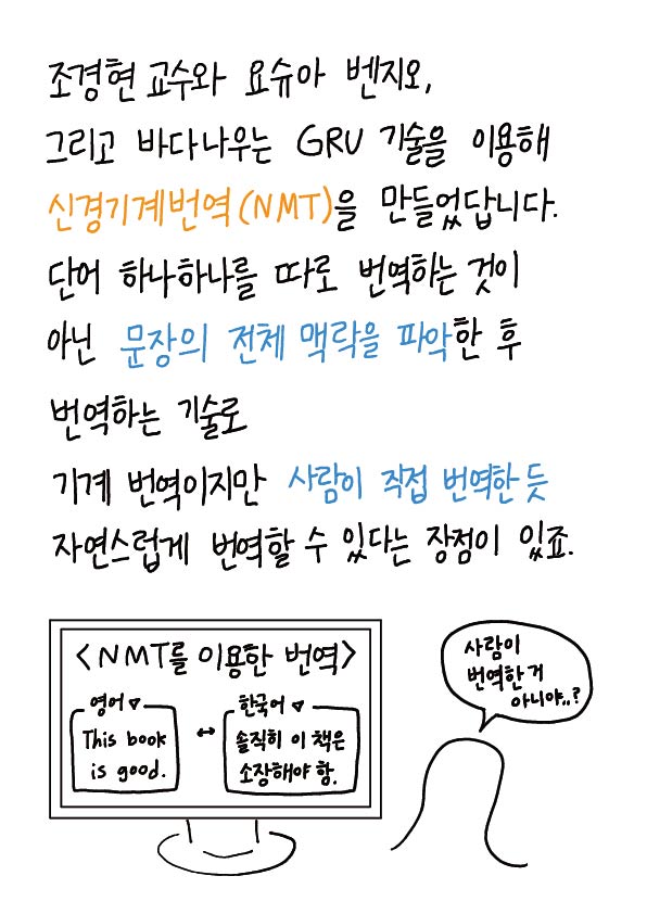 그는 인공지능 번역의 현실을 가져온 GRU(Gated Recurrent Units)를 제시해 주목을 받았는데요, GRU는 LSTM의 발전된 버전으로 신경기계번역(NMT)에 사용되는 핵심 기술이랍니다.
