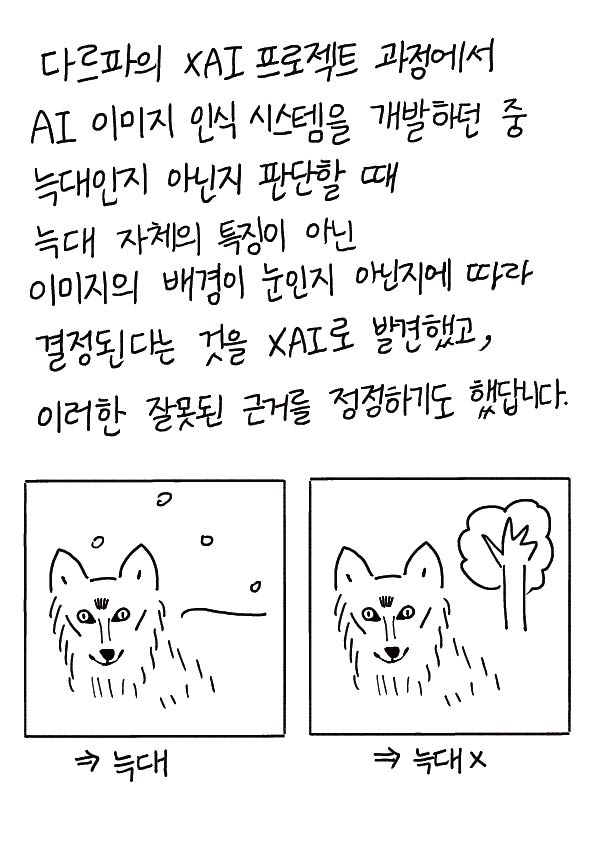 다르파의 XAI프로젝트 과정에서 AI이미지 인식 시스템을 개발하던 중 늑대인지 아닌지 판단할 때 늑대 자체의 특징이 아닌 이미지의 배경이 눈인지 아닌지에 따라 결정된다는 것을 XAI로 발견했고, 이러한 잘못된 근거를 정정하기도 했답니다.