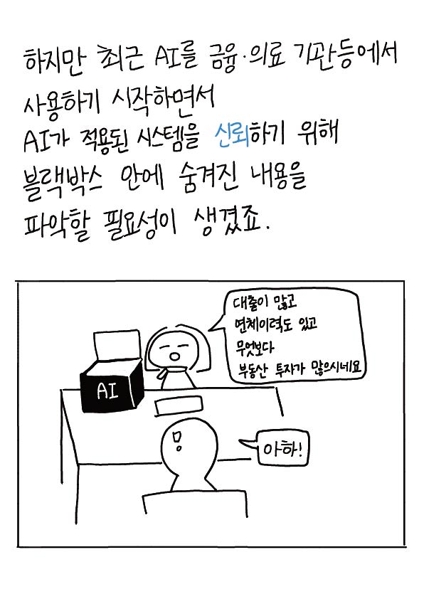 하지만 최근 AI를 금융 · 의료 기관등에서 사용하기 시작하면서 AI가 적용된 시스템을 신뢰하기 위해 블랙 박스 안에 숨겨진 내용을 파악할 필요성이 생겼죠.