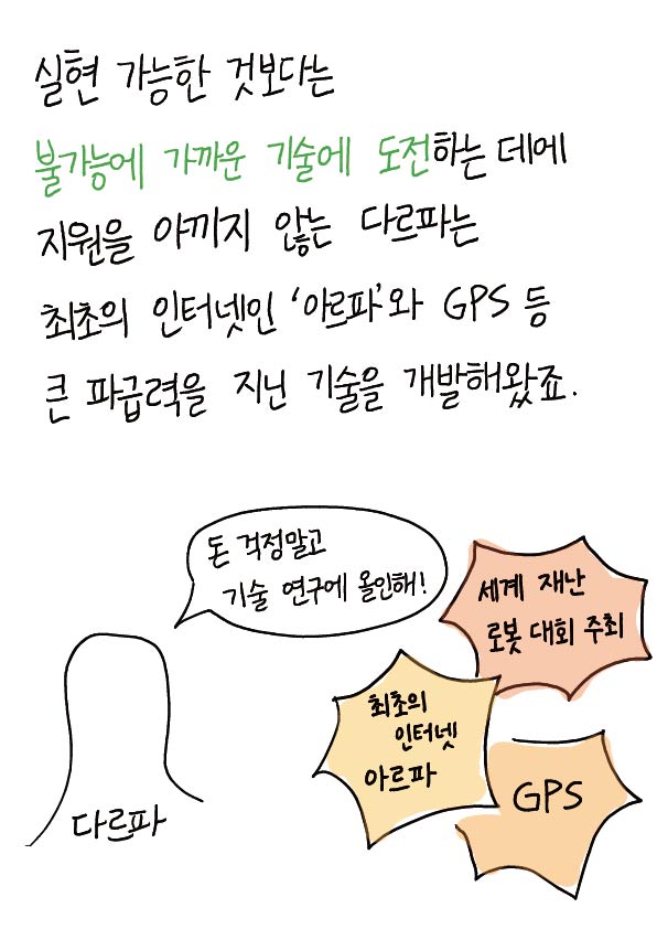 실현 가능한 것도다는 불가능에 가까운 기술에 도전하는데에 지원을 아끼지 않는 다르파는 최초의 인터넷인 '아르파'와 GPS등 큰 파급력을 지닌 기술을 개발해왔죠.