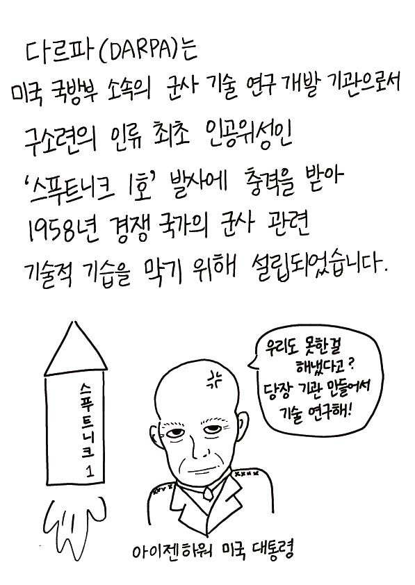 다르파(DARPA)는 미국 국방부 소속의 군사 기술 연구 개발 기관으로서 구소련의 인류 최초 인공위성인 '스푸트니크 1호' 발사에 충격을 받아 1958년 경쟁 국가의 군사 관련 기술적 기습을 막기 위해 설립되었습니다.