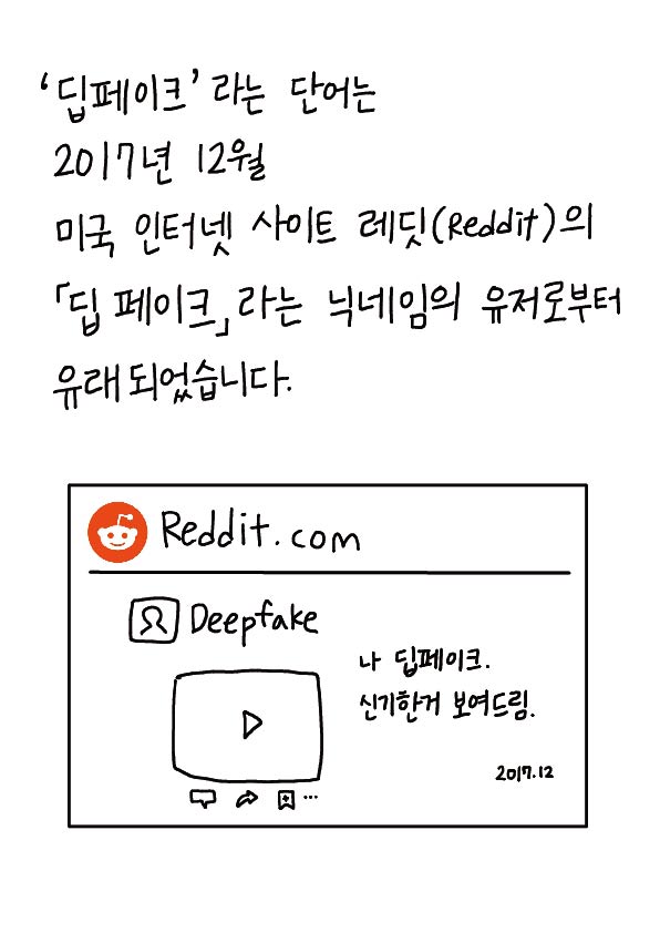 '딥페이크'라는 단어는 2017년 12월 미국 인터넷 사이트 레딧(Reddit)의 「딥 페이크」라는 닉네임의 유저로부터 유래되었습니다.