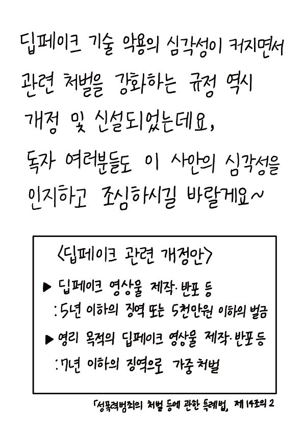 딥페이크 기술 악용의 심각성이 커지면서 관련 처벌을 강화하는 규정 역시 개정 및 신설되었는데요, 독자 여러분들도 이 사안의 심각성을 인지하고 조심하시길 바랄게요!