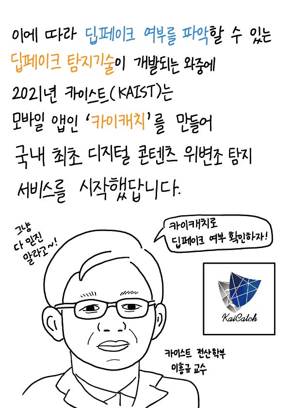 이에 따라 딥페이크 여부를 파악할 수 있는 딥페이크 탐지기술이 개발되는 와중에 2021년 카이스트(KAIST)는 모바일 앱인 '카이캐치'를 만들어 국내 최초 디지털 콘텐츠 위변조 탐지 서비스를 시작했답니다.