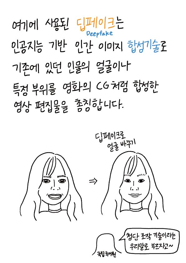 여기에 사용된 딥페이크는 인공지능 기반 인간 이미지 합성기술로 기존에 있던 인물의 얼굴이나 특정 부위를 영화의 CG처럼 합성한 영상 편집물을 총칭합니다.