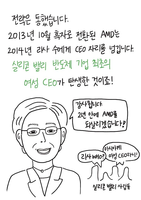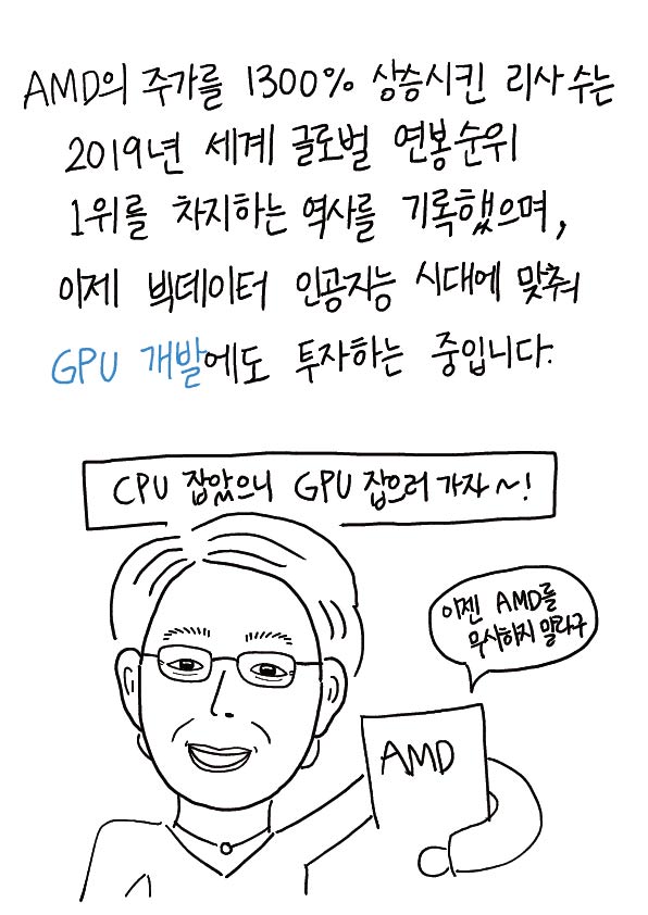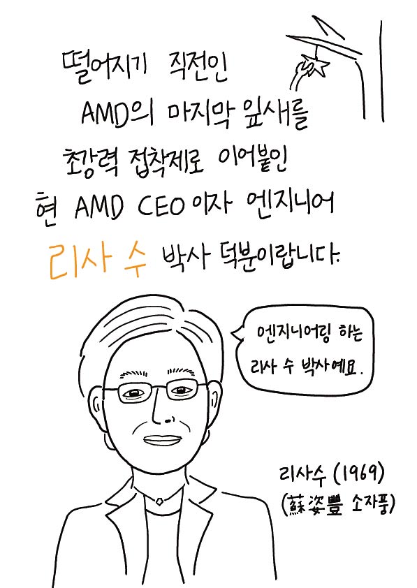 떨어지기 직전인 AMD의 마지막 잎새를 초강력 접착제로 이어붙인 현 AMD CEO이자 엔지니어 리사 수 박사 덕분이랍니다.