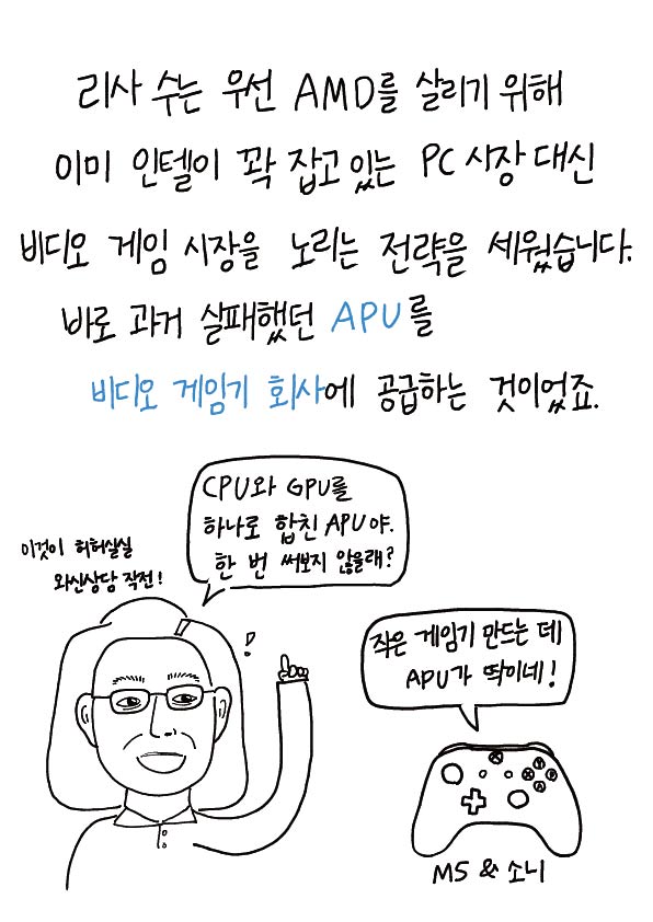 리사 수는 우선 AMD를 살리기 위해 이미 인텔이 꽉 잡고 있는 PC시장 대신 비디오 게임 시장을 노리는 전략을 세월습니다. 바로 과거 실패했던 APU를 비디로 게임기 회사에 공금하는 것이었죠.