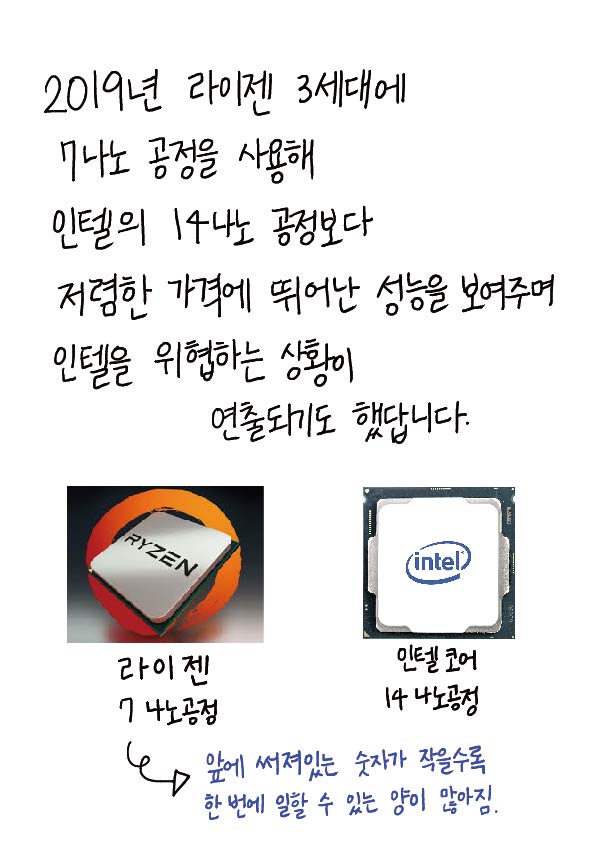 2019년 라이젠 3세대에 7나노 공정을 사용해 인텔의 14나노 공정보다 저렴한 가격에 뛰어난 성능을 보여주며 인텔을 위협하는 상황이 연줄되기도 했답니다.