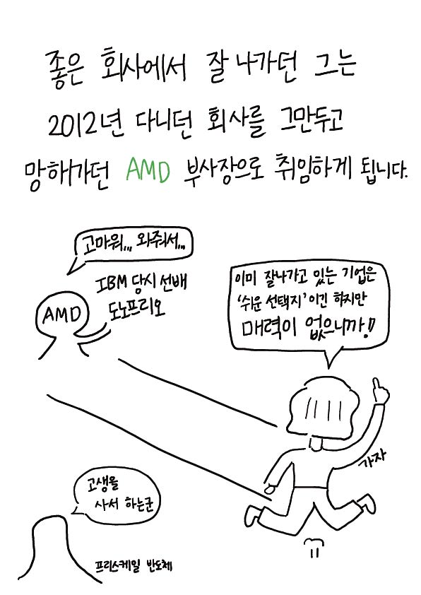 좋은 회사에서 잘 나가던 그는 2012년 다니던 회사를 그만두고 망해가던 AMD 부사장으로 취임하게 됩니다.