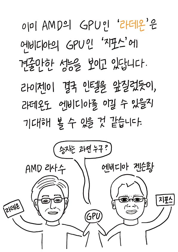 이미 AMD의 GPU인 '라데온'은 엔비디아의 GPU인 '지포스'에 결줄만한 성능을 보이고 있답니다. 라이젠이 결국 인텔을 앞질렀듯이, 라데온도 엔비디아를 이길 수 있을지 기대해 볼 수 있을 것 같습니다.