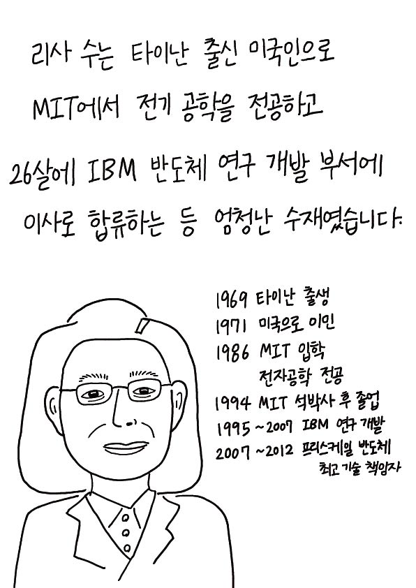 리사 수는 타이난 출신 미국인으로 MIT에서 전기 공학을 전동하고 26살에 IBM 반도체 연구 개발 부서에 이사로 합류하는 등 엄청난 수재였습니다.