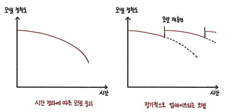 이처럼 시간에 따른 데이터의 변화를 ‘데이터 드리프트(Data Drift)’라고 부른다. 뗏목이 강물을 따라 흘러가듯 데이터도 시간을 따라 떠다닌다. 데이터가 변하면 머신러닝 모델도 이에 맞게 변해야 한다. 변화를 따라잡지 못한 모델은 정확도가 낮아진다. 데이터의 변화가 감지되면 머신러닝 모델의 정확도가 유지될 수 있도록 모델을 새로운 데이터로 다시 훈련시켜야 한다.