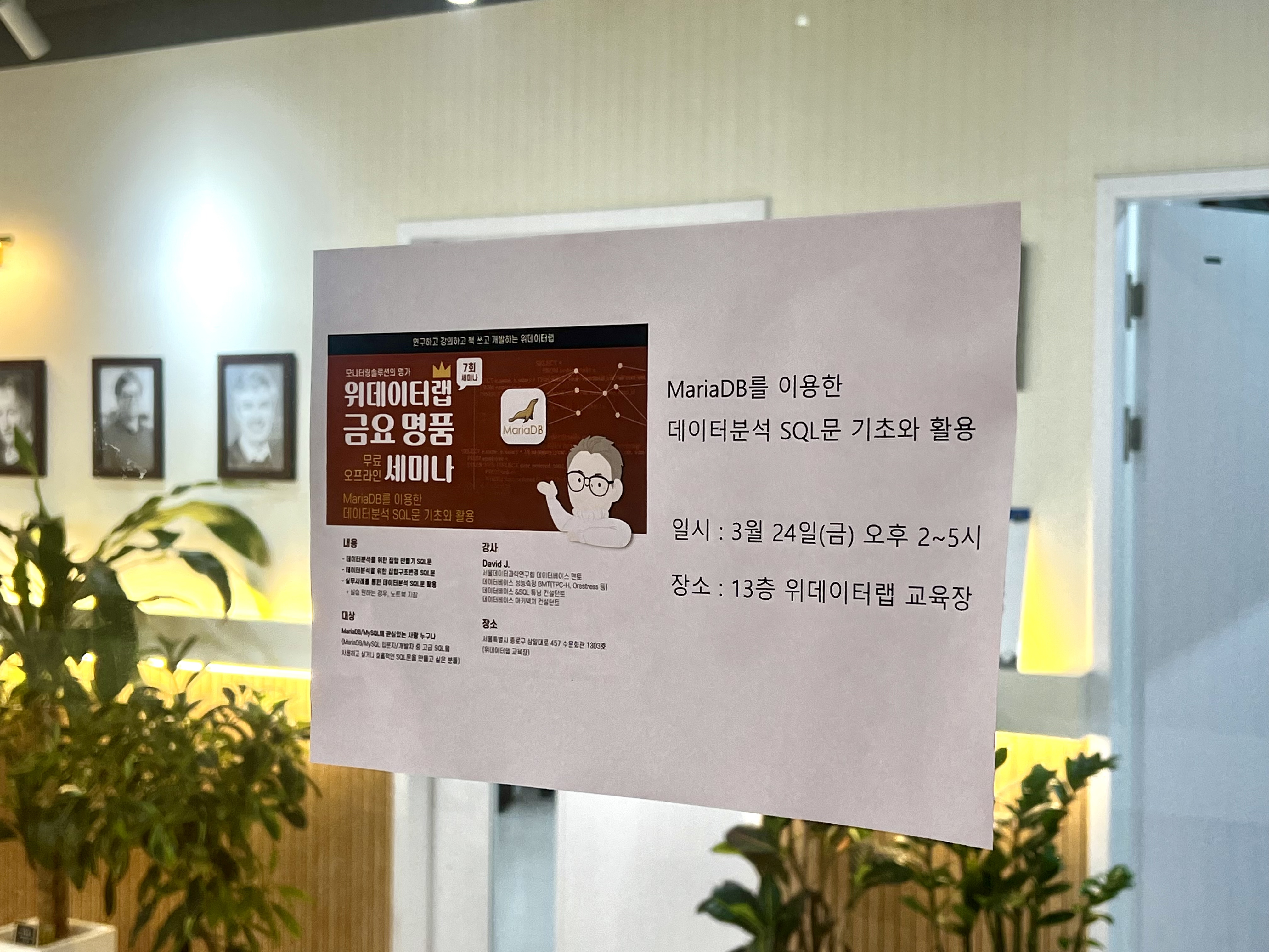 이번 세미나의 주제는 “MariaDB를 이용한 데이터분석 SQL문 기초와 활용“ 이였으며, 이론 설명과 실습을 위주로 약 3시간 정도 강의가 진행되었습니다.