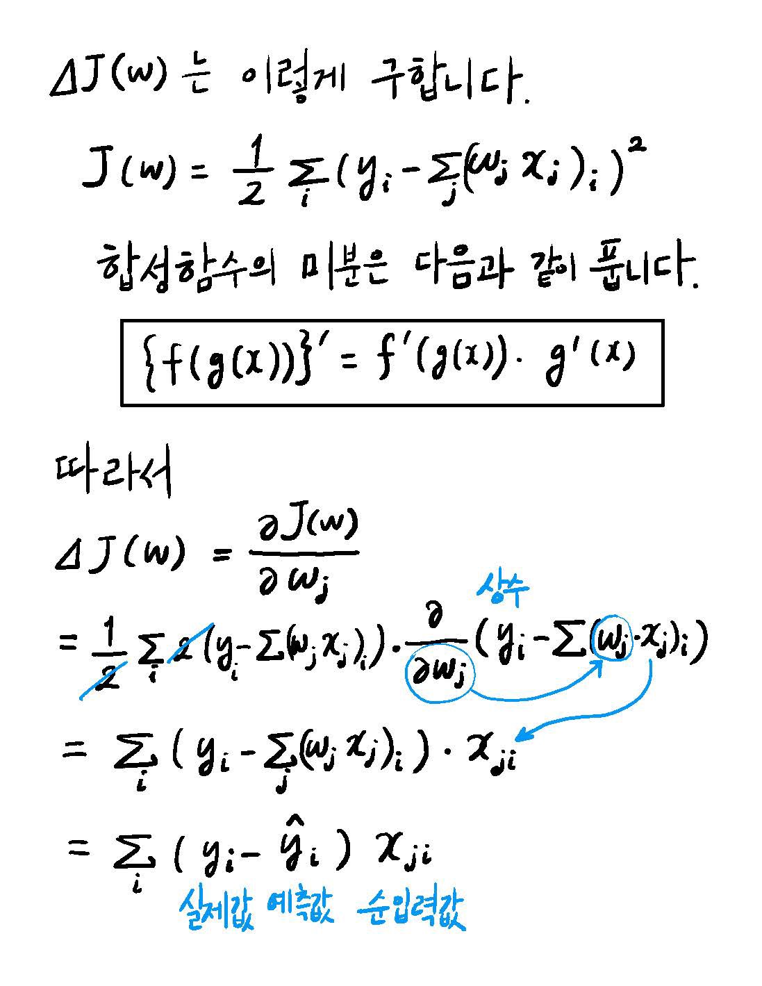 비용함수 J(w)의 미분값은 이렇게 구합니다.