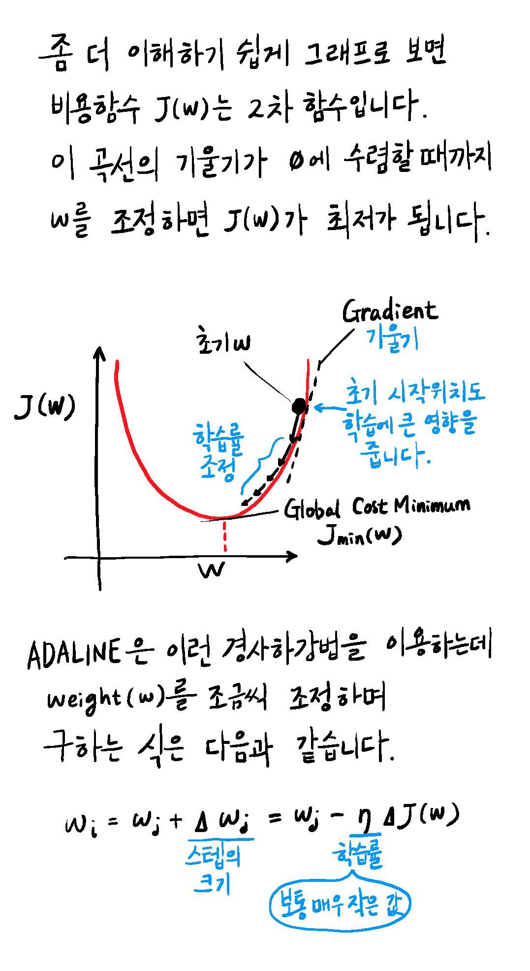 아달라인은 비용함수가 최저가 되는 w값을 찾는 문제로 귀결됩니다.